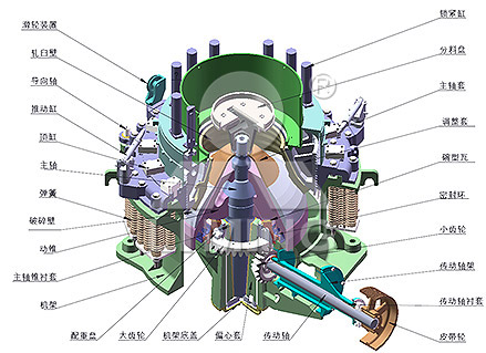 工作時,由電動機通過三角帶、大帶輪、傳動軸、小錐齒輪、大錐齒輪帶動偏心套旋轉,破碎圓錐軸心線在偏心軸套的迫動下做旋轉擺動,使得破碎壁表面時而靠近又時而離開軋臼壁的表面,從而使物料在定錐與動錐組成的環(huán)形破碎腔內不斷地受到?jīng)_擊、擠壓和彎曲而破碎。經(jīng)過多次擠壓、沖擊和彎曲后,物料破碎至要求粒度經(jīng)下部排出。