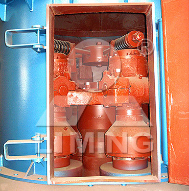 工作時,將需要粉碎的物料從機罩殼側(cè)面的進料斗加入機內(nèi),依靠懸掛在主機梅花架上的磨輥裝置,繞著垂直軸線公轉(zhuǎn),同時本身自轉(zhuǎn),由于旋轉(zhuǎn)時離心力的作用,磨輥向外擺動,緊壓于磨環(huán),使鏟刀鏟起物料送到磨輥與磨環(huán)之間,因磨輥的滾動碾壓而達到粉碎物料的目的。