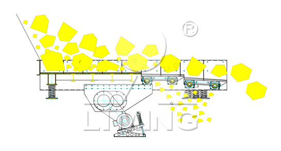 TSW給料機采用慣性式雙偏心軸激振器能產(chǎn)生定向激振力。兩軸之間有一對傳動比為1的齒輪副連接,保障其回轉(zhuǎn)方向相反,轉(zhuǎn)速相等。通過電動機驅(qū)動,兩偏心軸旋轉(zhuǎn),由于兩軸上的偏心質(zhì)量和偏心距大小相等,所產(chǎn)生的慣性力在一個方向互相抵消,而在另一個方向互相疊加,從而合成的定向激振力,使與此激振器剛性連接的給料槽體在支承彈簧上做強制振動,物料在振動力的作用下,在料槽上作滑動及拋擲運動,從而使物料前移而達到給料目的。當物料通過槽體上的蓖條時,較小的物料通過蓖條之間的間隙落下,不再經(jīng)過破碎而直接進入下道破碎工序,從而起到預(yù)篩分效果,充分保障破碎設(shè)備的破碎效率及能力。